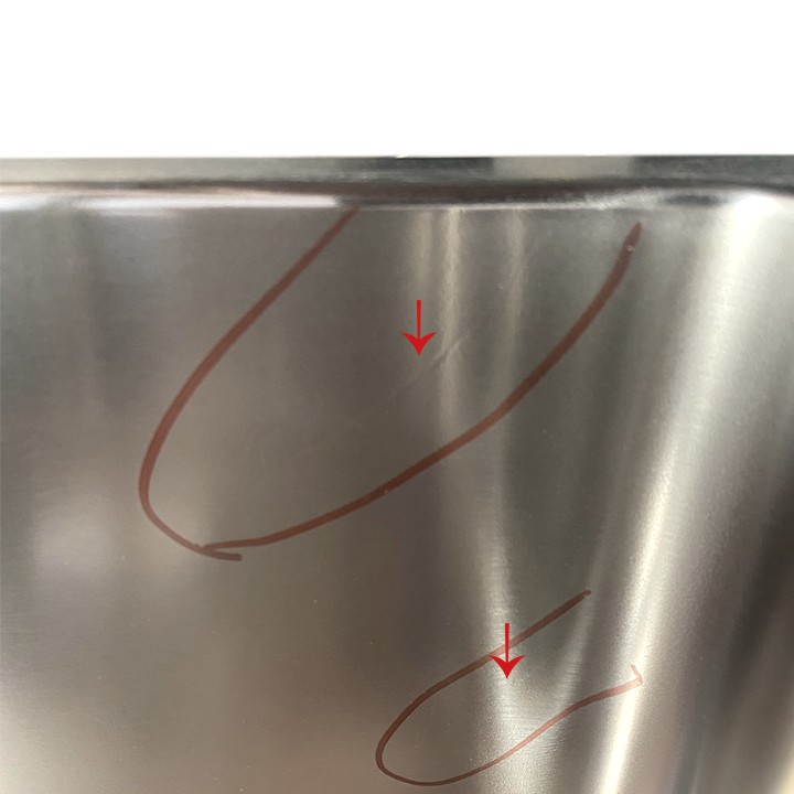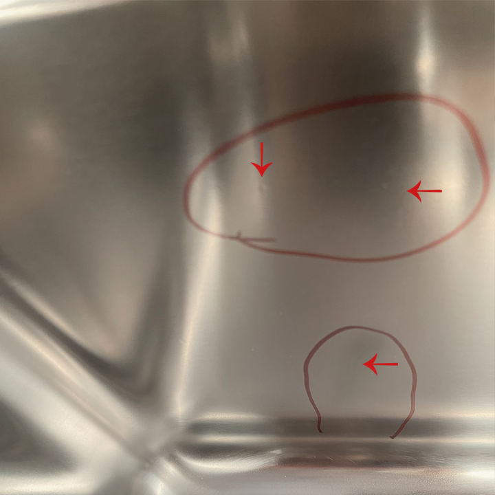 Product has very slight marks on the finish on the bottom of the bowl on the right and left sides.